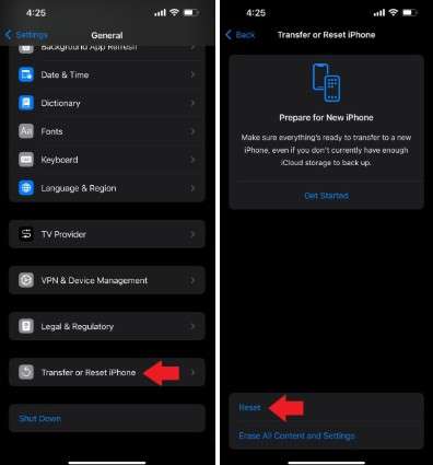 Étape 2 Faites défiler jusqu'à "Transférer ou réinitialiser l'iPhone" et appuyez sur "Réinitialiser".